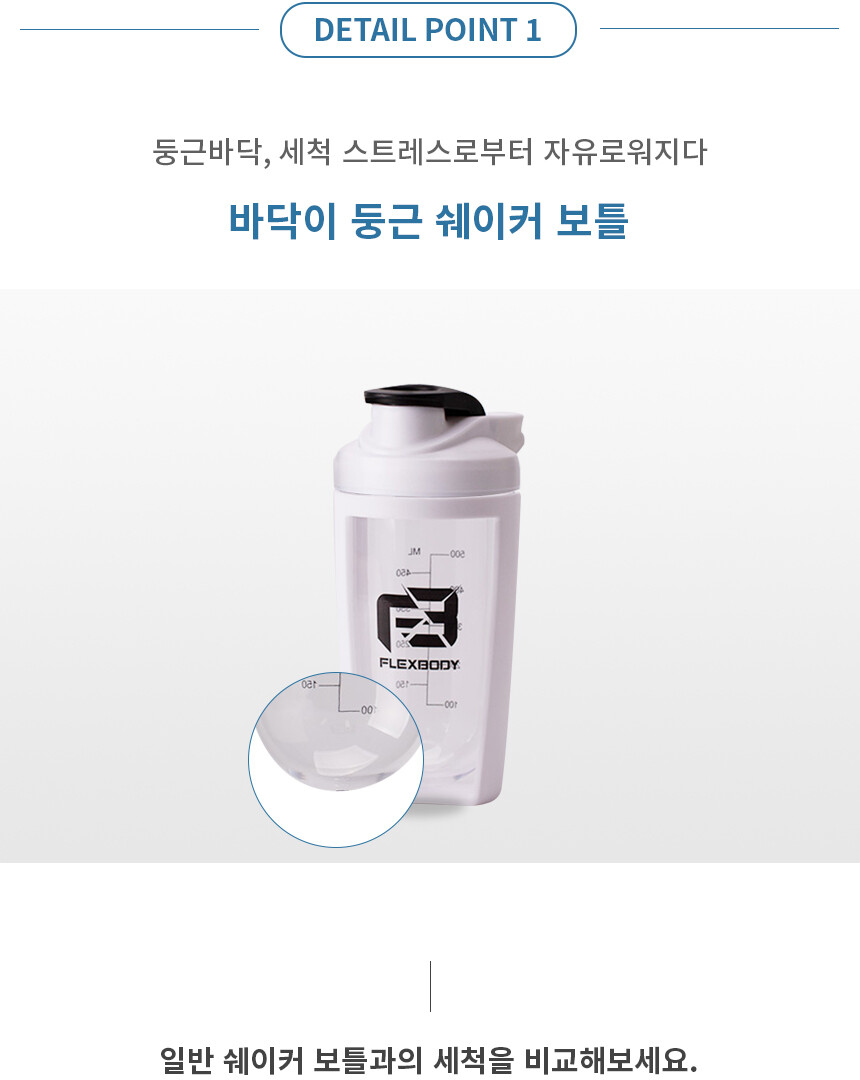 더 이상 쉐이커볼은 필요없어요. 둥근 바닥 구조로 설계되어 쉐이커볼 없이도 쉐이킹이 가능해요. 투명한 본체와 둥근바닥으로 물통 바닥 구석에 끼인 찌꺼기까지 말끔하게 세척이 가능해서 보다 편리하고 깨끗하게 물통 사용이 가능해요