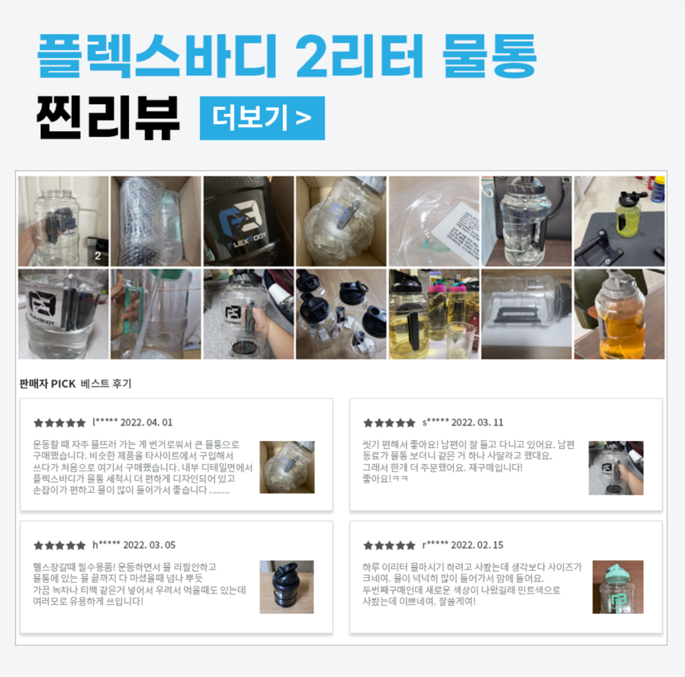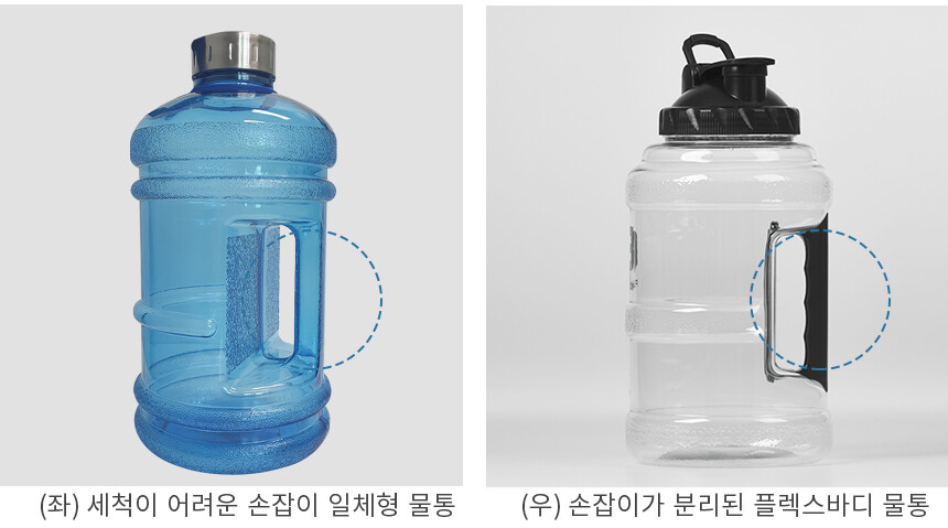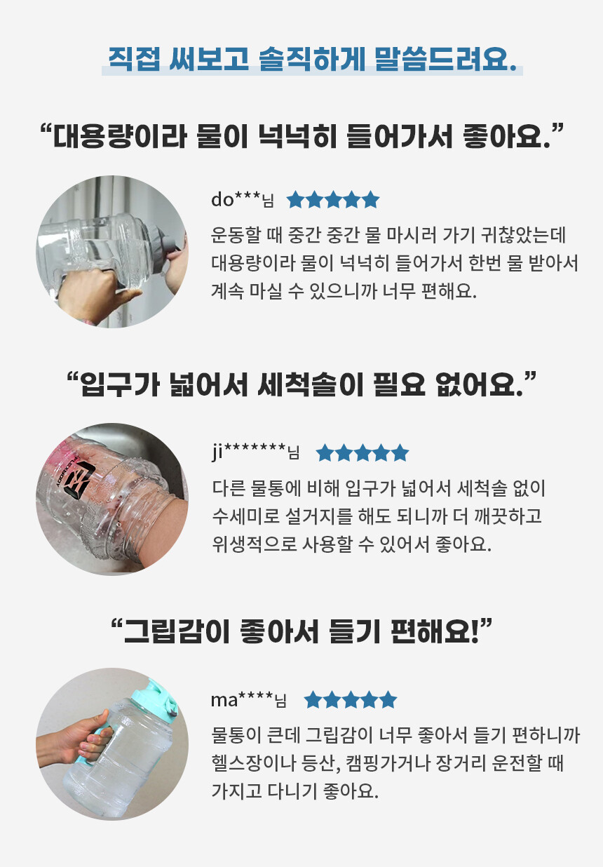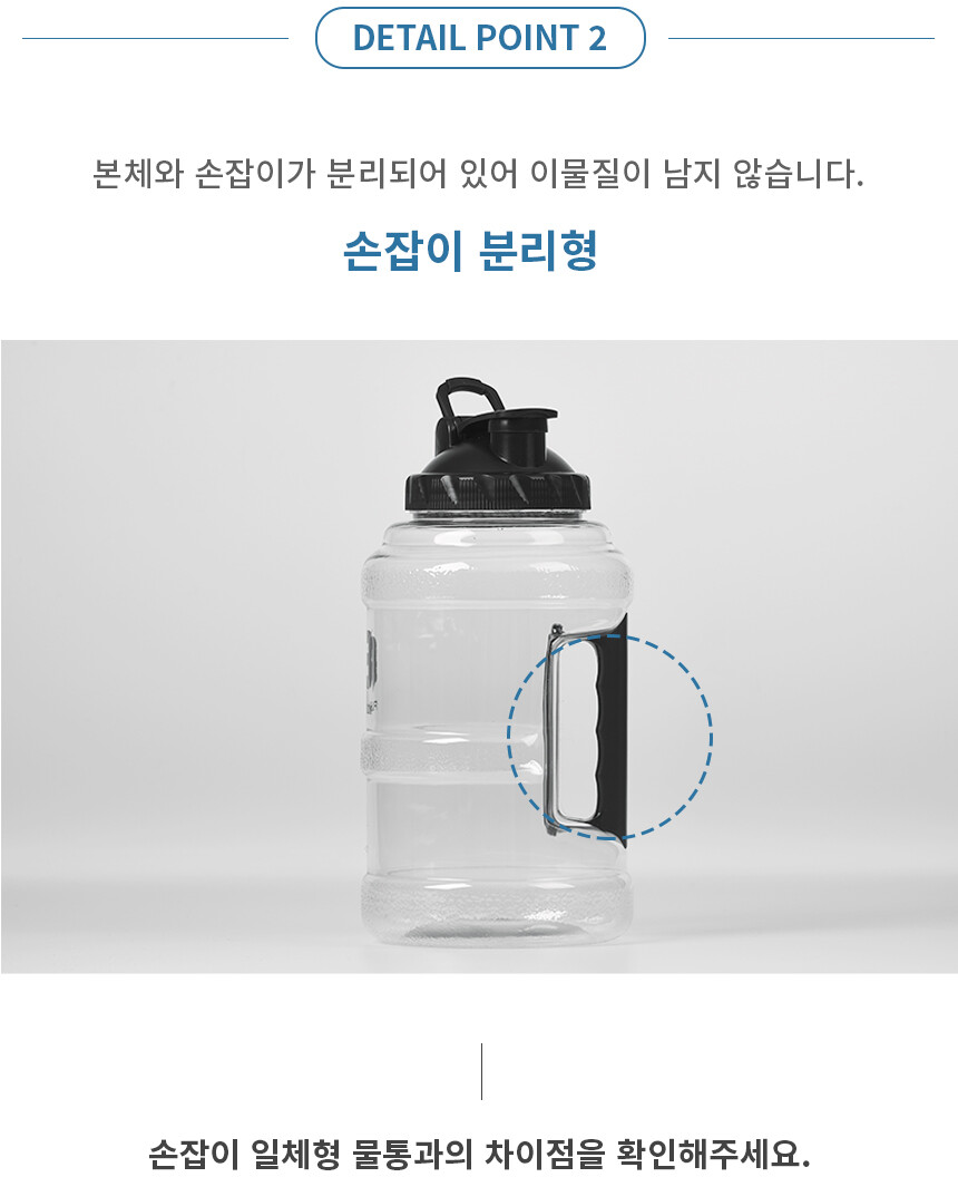 누적 판매량 100,000개 돌파!! 세척솔이 필요없는 2리터 물통 대표 브랜드. 성인 손이 들어가는 물통 입구 & 물통과 손잡이가 분리되어 세척이 정말 편하고 쉬워요.